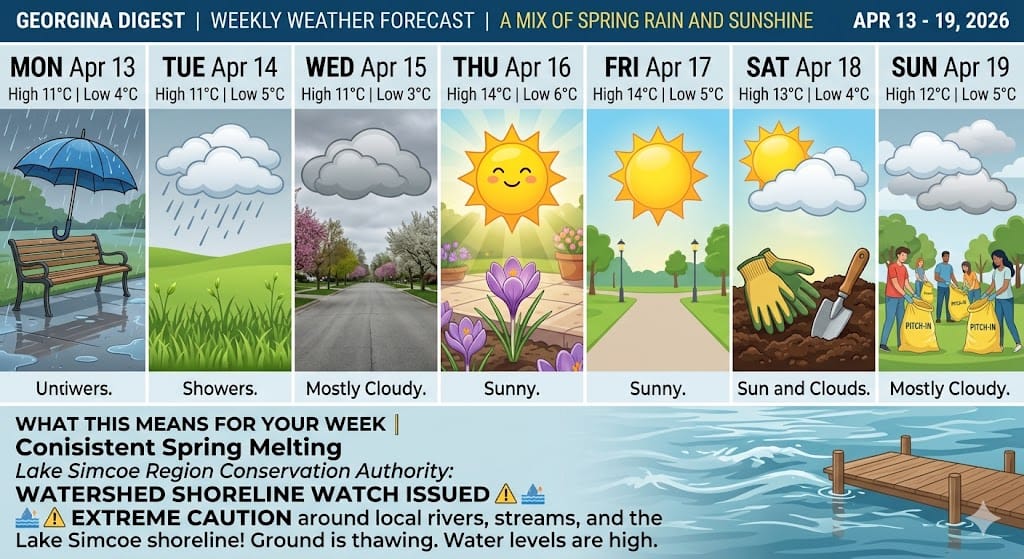 What this means for your week Consistent Spring Melting: The Lake Simcoe Region Conservation Authority has issued a watershed shoreline watch. With more rain on the way early in the week and the ground fully thawing, water levels are high. Please exercise extreme caution around local rivers, streams, and the Lake Simcoe shoreline this week!